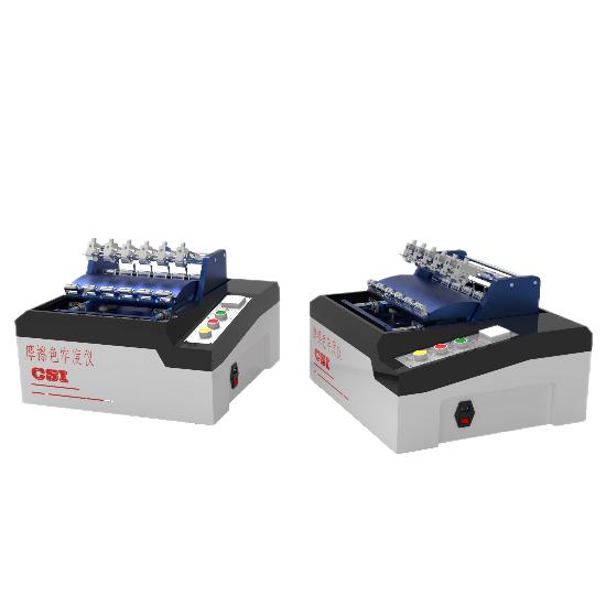 在有機溶劑摩擦色牢度測試中(zhōng):模擬織物在使用有機溶劑清洗時的色牢度情況。試驗時,將樣品與沾(zhān)有有機溶劑的摩擦用未染色棉布使用摩擦測試儀用一定的方(fāng)式相互摩擦(cā),再分別用變色灰卡和沾色灰卡評定樣品的(de)變色和未染色棉布的沾色(sè)情況。